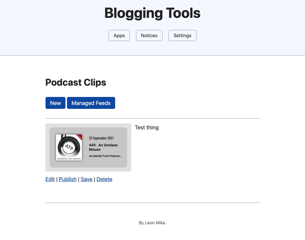 Right now, I think I’ll use a hash of the episode Guid for the path. ATP seems to have randomly generated hashes but I know that some RSS feeds choose to use URLs, which won’t do for a path. Why the Guid? Well, I want to be able to regenerate a clip if need be, replacing the existing one.
