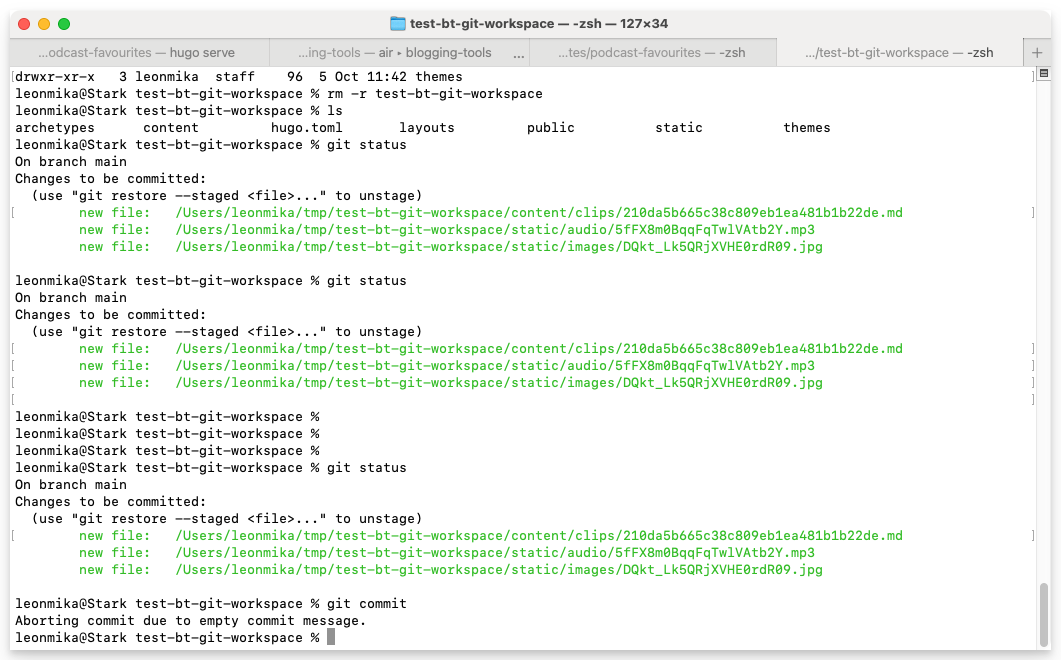 Oh, before that, I finding a cannot create empty commit: clean working tree. I’m opening the work tree between staging the files and committing. Is that the problem?