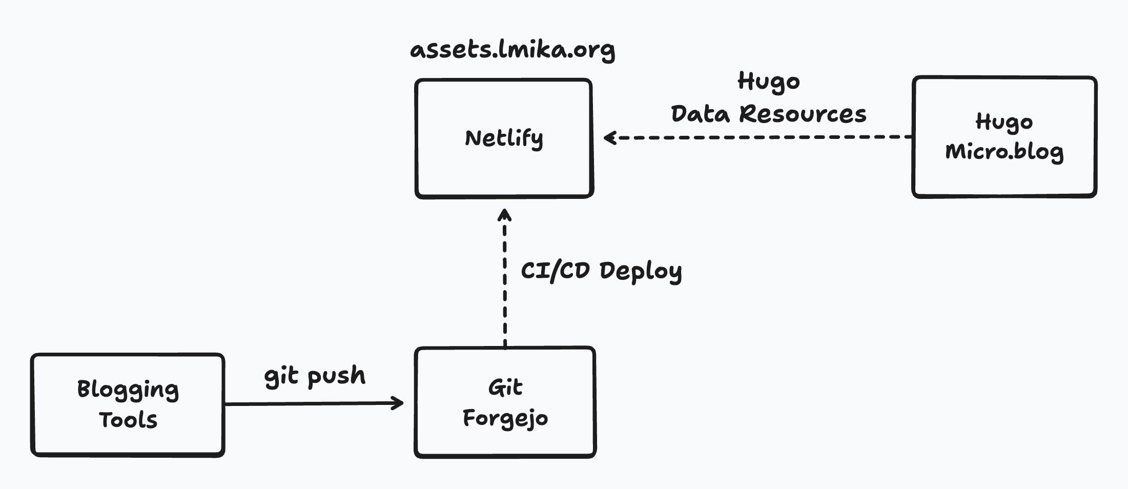 The idea is to setup an assets project which will be hosted on Netlify. When I want to change anything in it, Blogging Tools will push new changes via Git, which will run a pipeline that will deploy the updates to Netlify. Then, next time I add a blog post, Hugo will pick up these data fields and use it to build the site, probably by setting an attribute that will itself be picked by CSS’s newly improved attr() function to set the banner background.