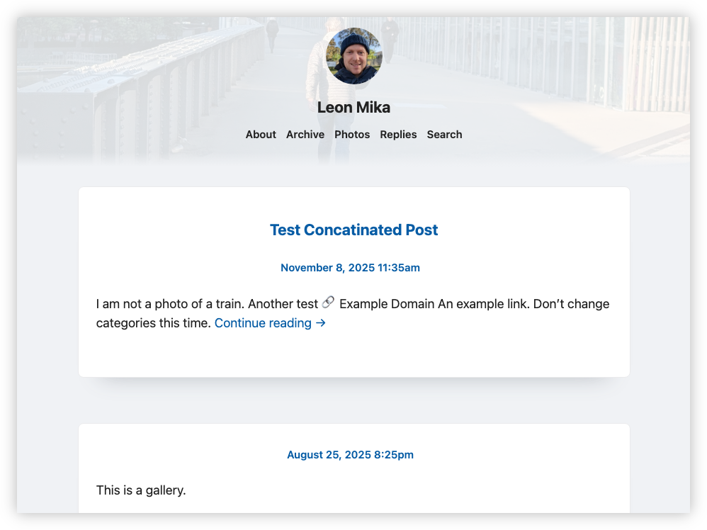 So, the next thing to do is to add a banner image. I’m thinking of a slightly washed out version of the image, with a subtle gradient to the body housing the cards. I had to adjust the header template a little to move the site-header to a wrapping div. This allowed me to add new CSS to allow the header to span the entire width of the page. It’s really fortunate that the Card theme styles the CSS classes, and not the HTML elements themselves. It also allowed me to add a new HTML element with a header-end class to act as the gradient blend from the backing image to the regular background colour: