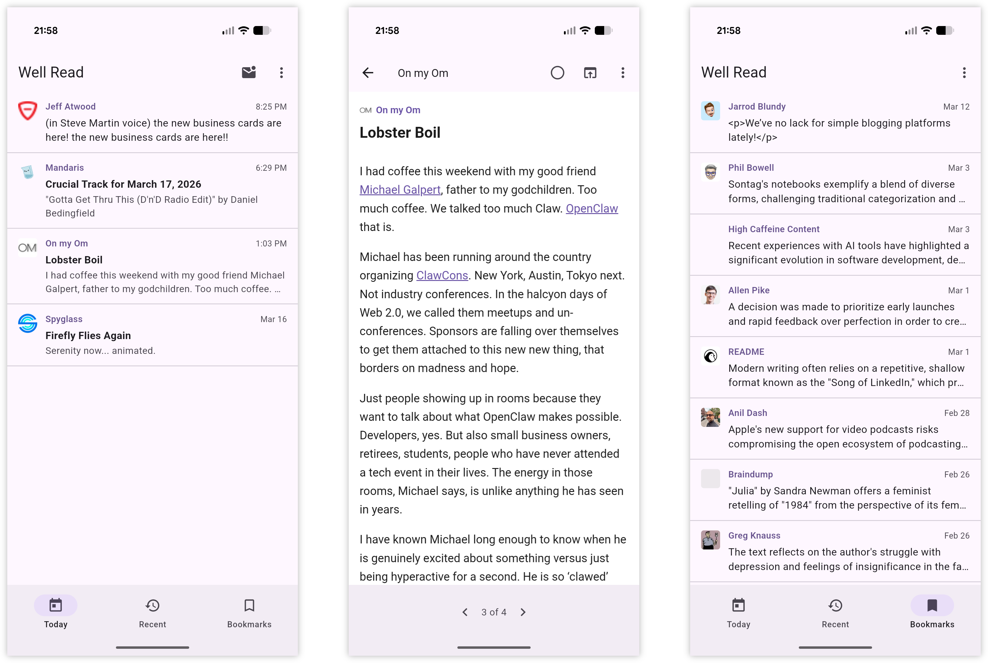 It's been a week since I learnt about Inkwell's API and got an agent to start work on an RSS reader. Since then, Well Read has been in a state of flux, as I ask for agents to make changes to the interaction and layout. I think I've got it in a pretty good state now, certainly in a state that works well for me.